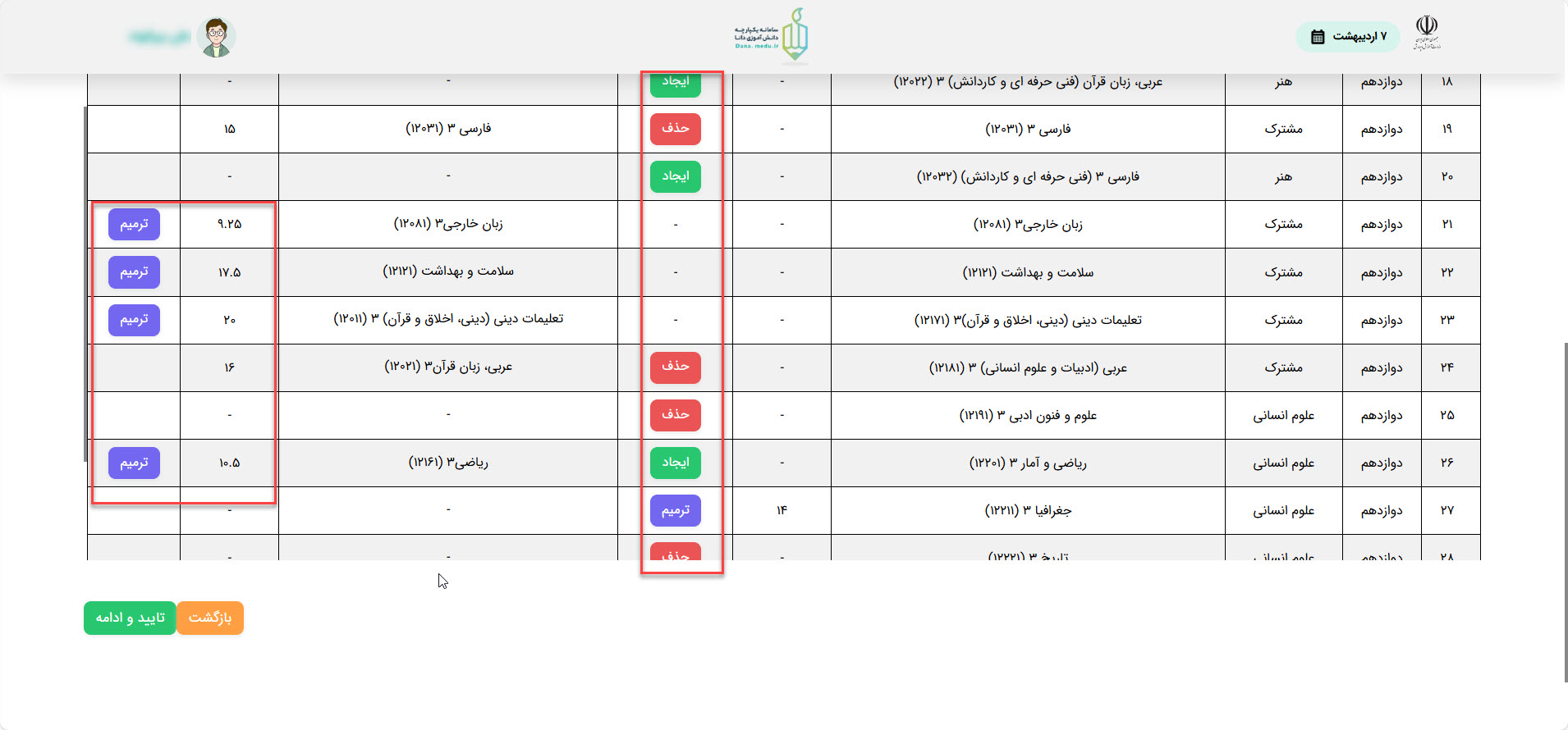 نکته پنجم: در صورت نیاز به اصلاح دروس میتوانید درسهای مربوطه را اصلاح کرده عملیات تایید را تا پایان انجام دهید. البته پیشنهاد موکد میشود که این کار به هیچ وجه توسط شما انجام نگیرد اگر هم قرار بر اصلاح است حتماً با حضور خود دانش آموز انجام گیرد.