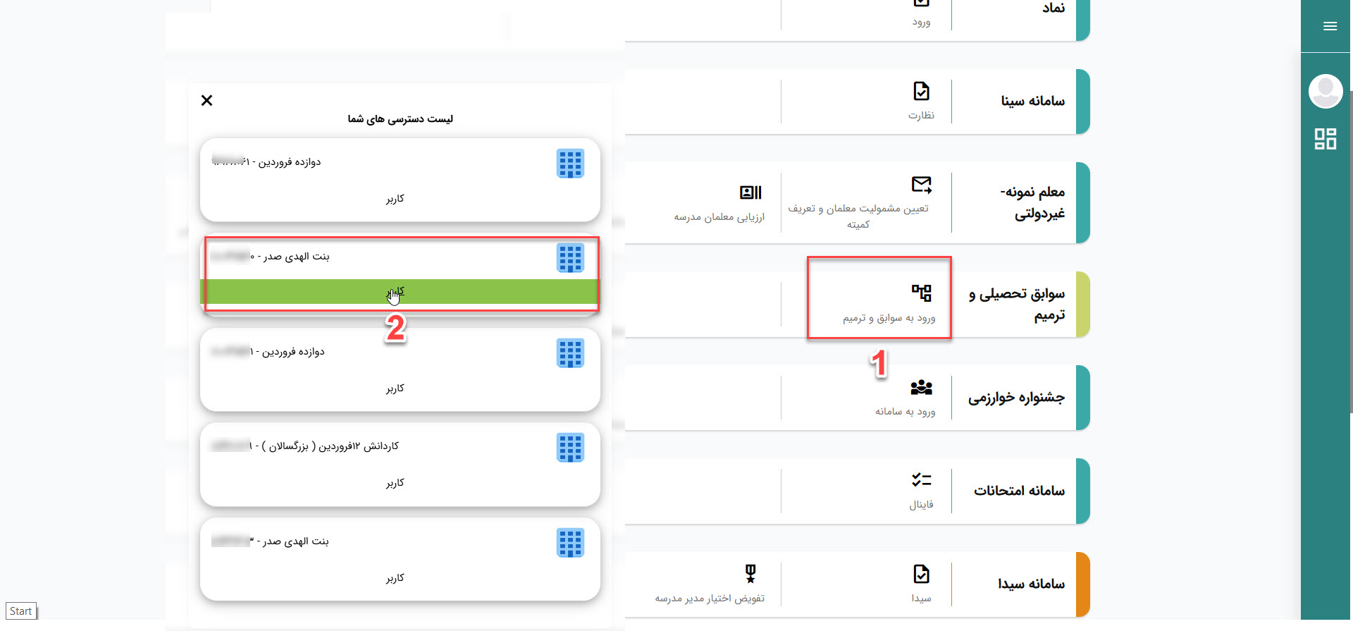 ➖ مدیر دبیرستان پس از ورود به سها عنوان سوابق تحصیلی و ترمیم را کلیک مینماید. در پنجره باز شده مدرسه مورد نظر را انتخاب میکند.