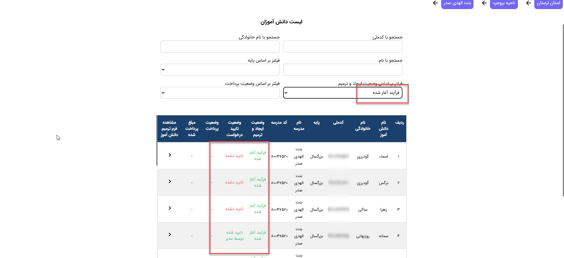 ➖ در صفحه جدید میتوانید با استفاده از عنوانهای بخش وضعیت ایجاد و ترمیم اسامی دانش آموزان را مشاهده نمایید. تصویر زیر مربوط به اسامی دانش آموزان تایید نشده است.
