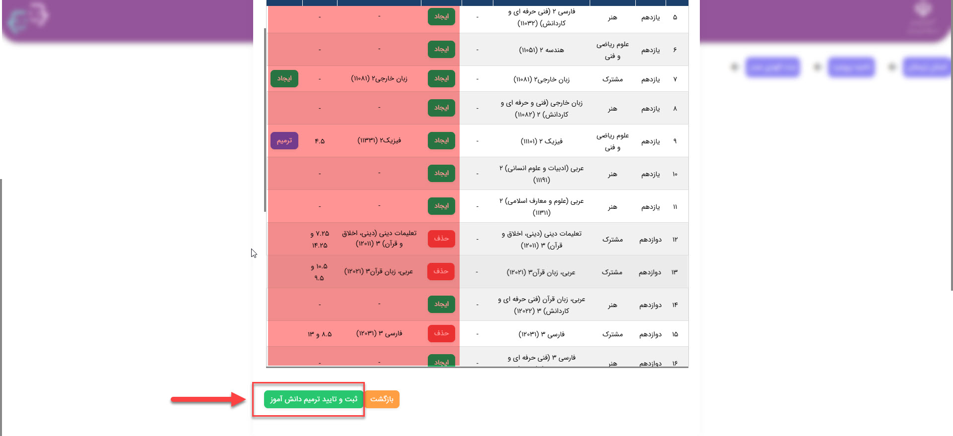 ➖ با مشاهده دروس انتخابی دانش آموز و اطمینان از صحت اطلاعات، عنوان ثبت و تایید ترمیم دانش آموز را لمس نمایید.