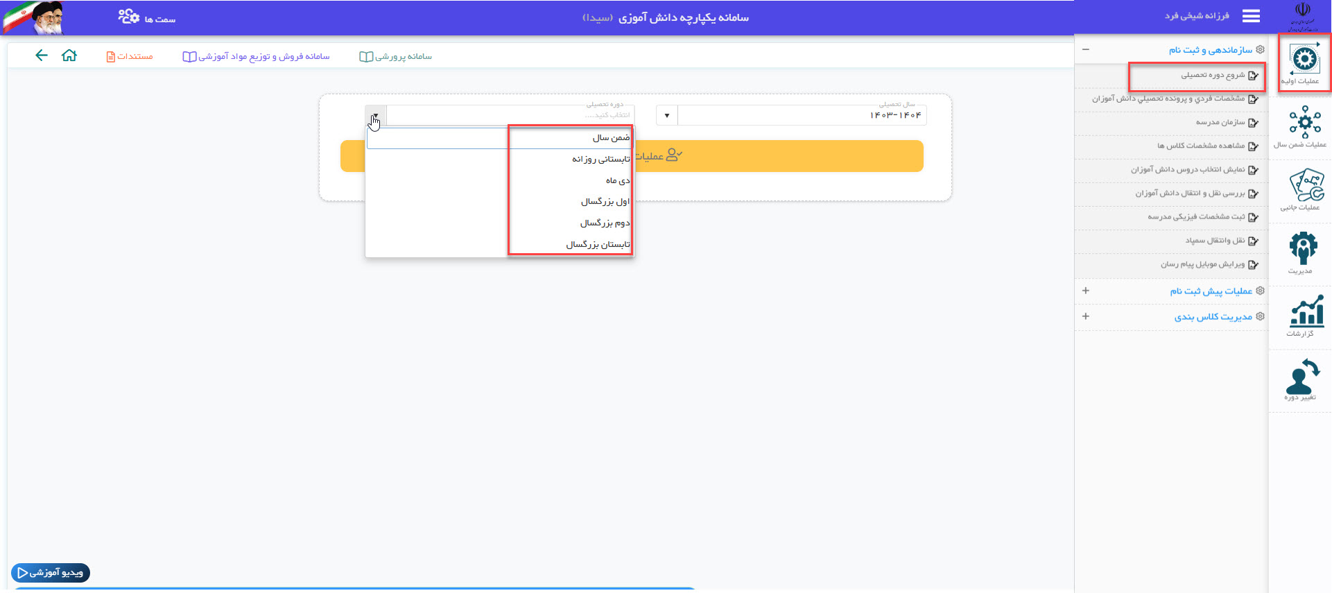 ➖ پس از ورود به سیدا با کاربری مدیر ابتدا از قسمت عملیات اولیه سازماندهی و ثبت نام عنوان شروع دوره تحصیلی را لمس نمایید.