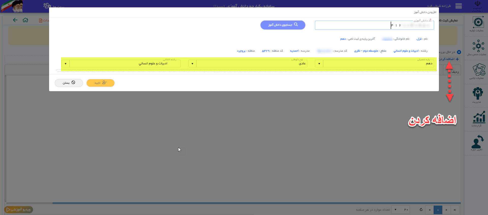 ➖ در پنجره جدید کد دانش آموز را وارد و عنوان دانش آموز را لمس کنید. بعد از مشاهده اطلاعات دانش آموز اطلاعات بخش پایه، نوع داوطلب و رشته را مشخص و در نهایت تایید نمایید.