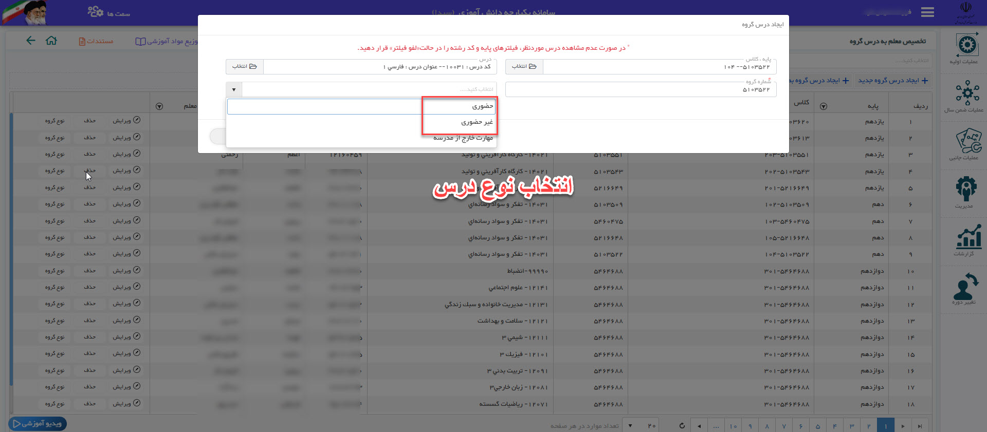 ✍️ نکته هشتم: در تابستان چون دروس به دو صورت حضوری و غیر حضوری تعریف میشوند بنابراین در ابتدا دروس مورد نظر را با استفاده از ایجاد در گروه جدید به صورت حضوری/ غیرحضوری تعریف نمایید.