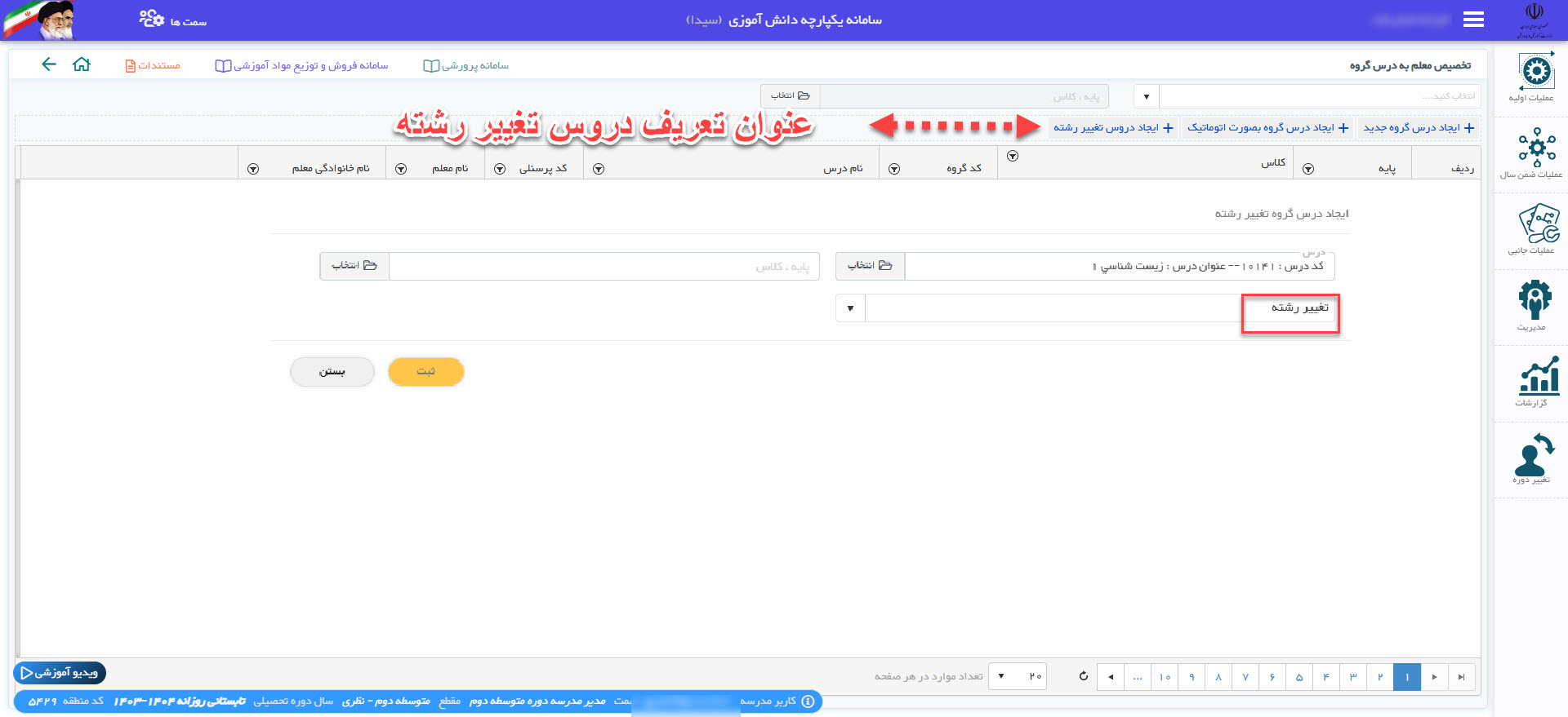توجه ۸: در تعریف دروس تغییر رشته نیازی نیست که شما حتماً رشته مورد نظر را در مدرسه خود داشته باشید در زمان تعریف می توانید این دروس را در یکی از کلاس ها البته با توجه به رشته دانش آموز به انتخاب خودتان قرار دهید.