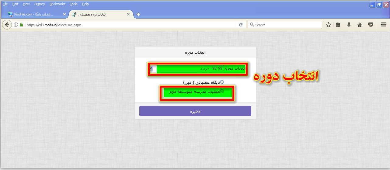 الف) از قسمت انتخاب دوره، دوره مربوطه مثلا (خرداد 99-98) را انتخاب و از دو گزینه پایین عنوان ( عملیات مدرسه متوسطه دوم) را تیک زده و ذخیره نمایید.