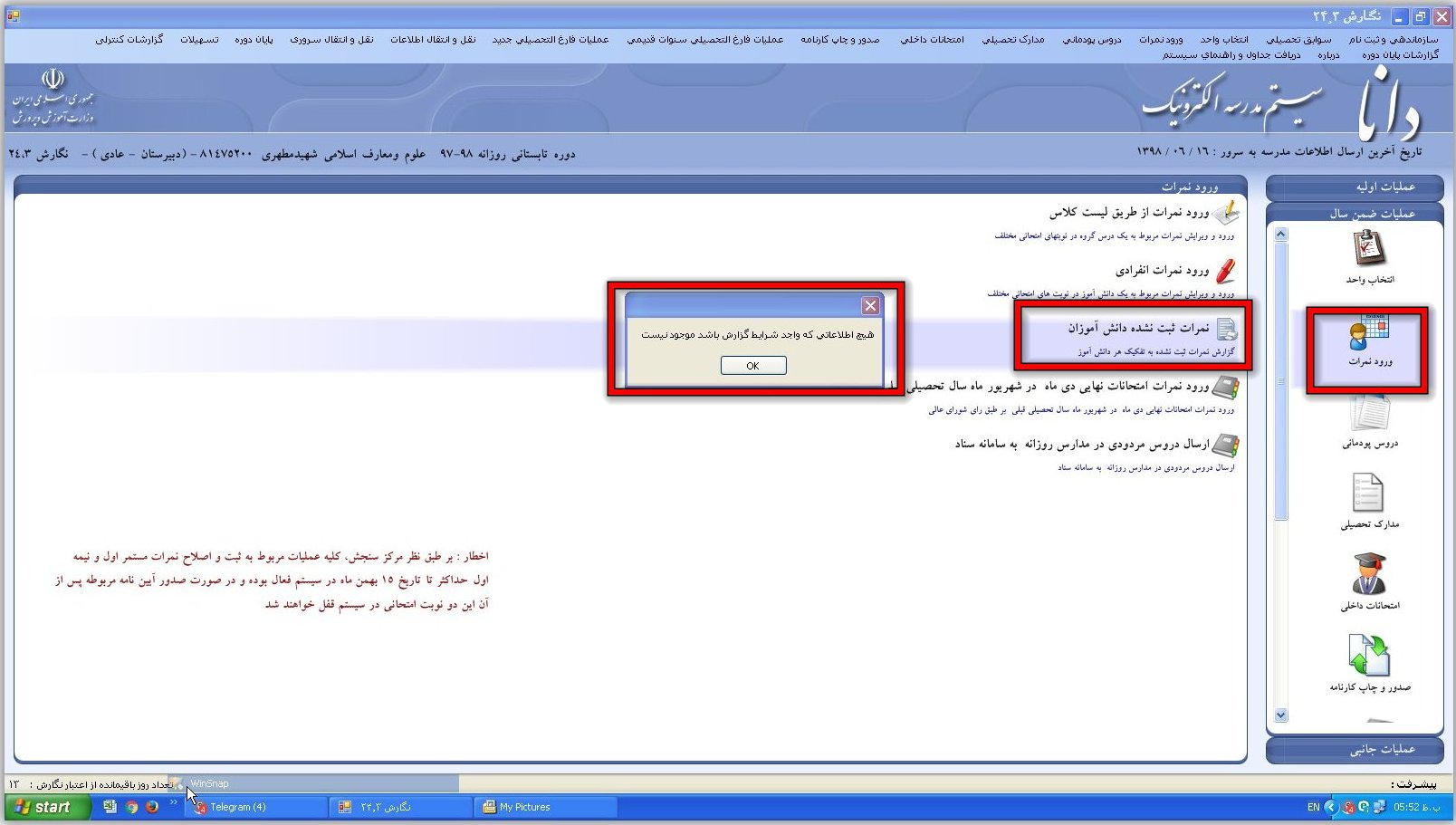 اگر با پیام ((هیچ اطلاعاتی که واجد شرایط گزارش باشد موجود نیست)) روبرو شدید یعنی کلیه نمرات ثبت شده اند.