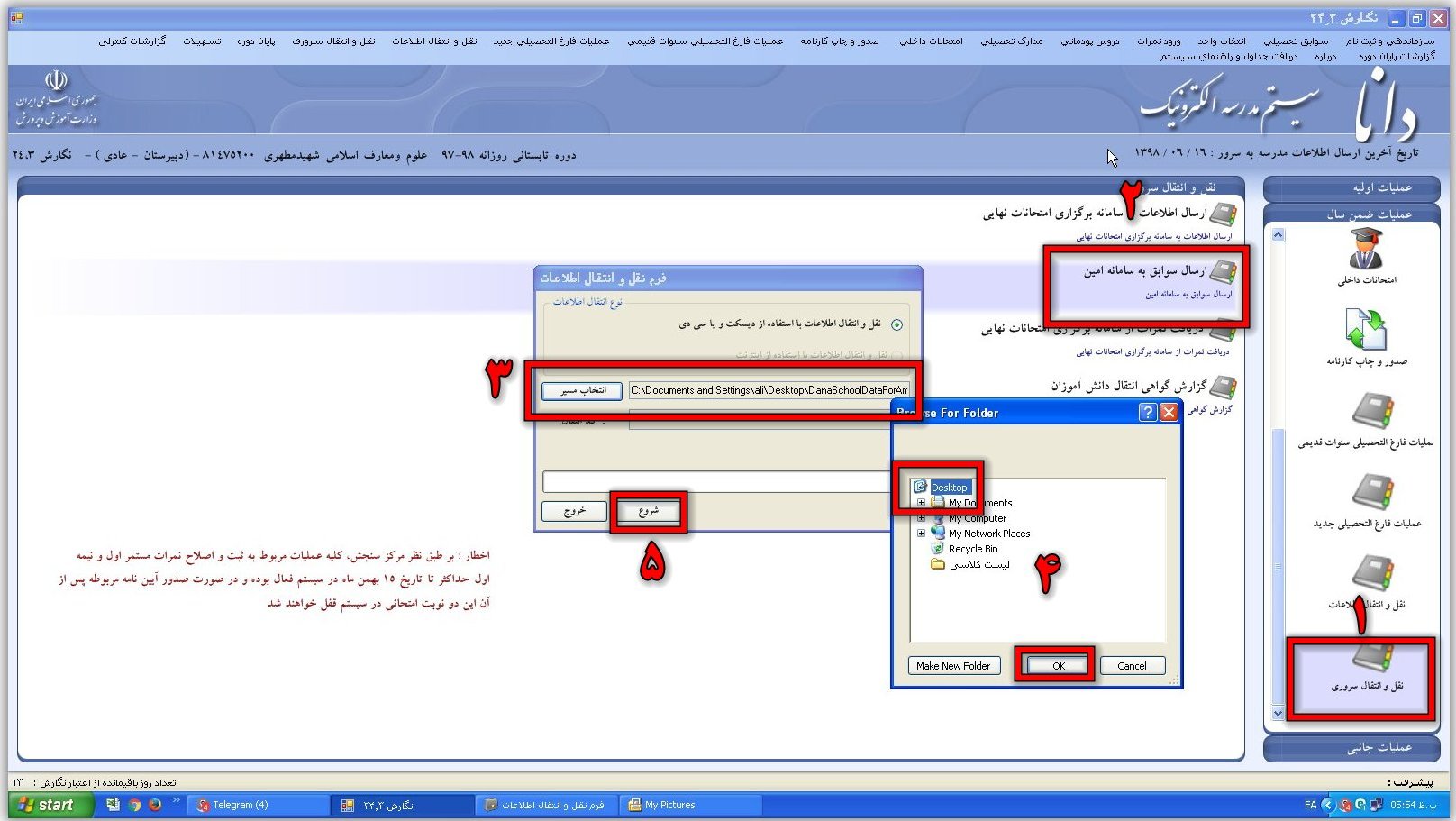 بعد از تکمیل مراحل فوق، وارد قسمت عملیات ضمن سال / نقل و انتقال سروری شده و گزینه ارسال سوابق به سامانه امین را انتخاب نمایید به پیامی که داده خواهد شد جواب مثبت دهید و هم چنین برای پیام بعدی نیز عنوان تایید را لمس نمایید. در این قسمت سیستم به بررسی و پردازش اطلاعات دانش آموزان می پردازد. پس از پایان این بخش محل ذخیره فایل خروجی را انتخاب نمایید. برای این کار ابتدا عنوان انتخاب مسیر را لمس نمایید و محل ذخیره قایل را تعیین کنید و در نهایت بر روی کلمه شروع کلیک نمایید.