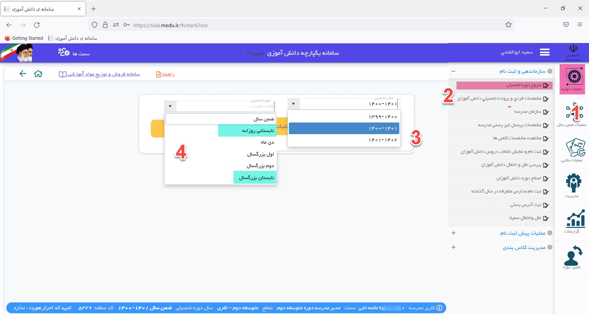 دو) در صفحه جدید از قسمت سال تحصیلی، سال 1402 - 1401 را انتخاب نمایید. در مرحله بعد بخش دوره تحصیلی، دوره تابستانی روزانه (تابستان بزرگسال) را انتخاب و بر روی عنوان عملیات شروع دوره کلیک نمایید.