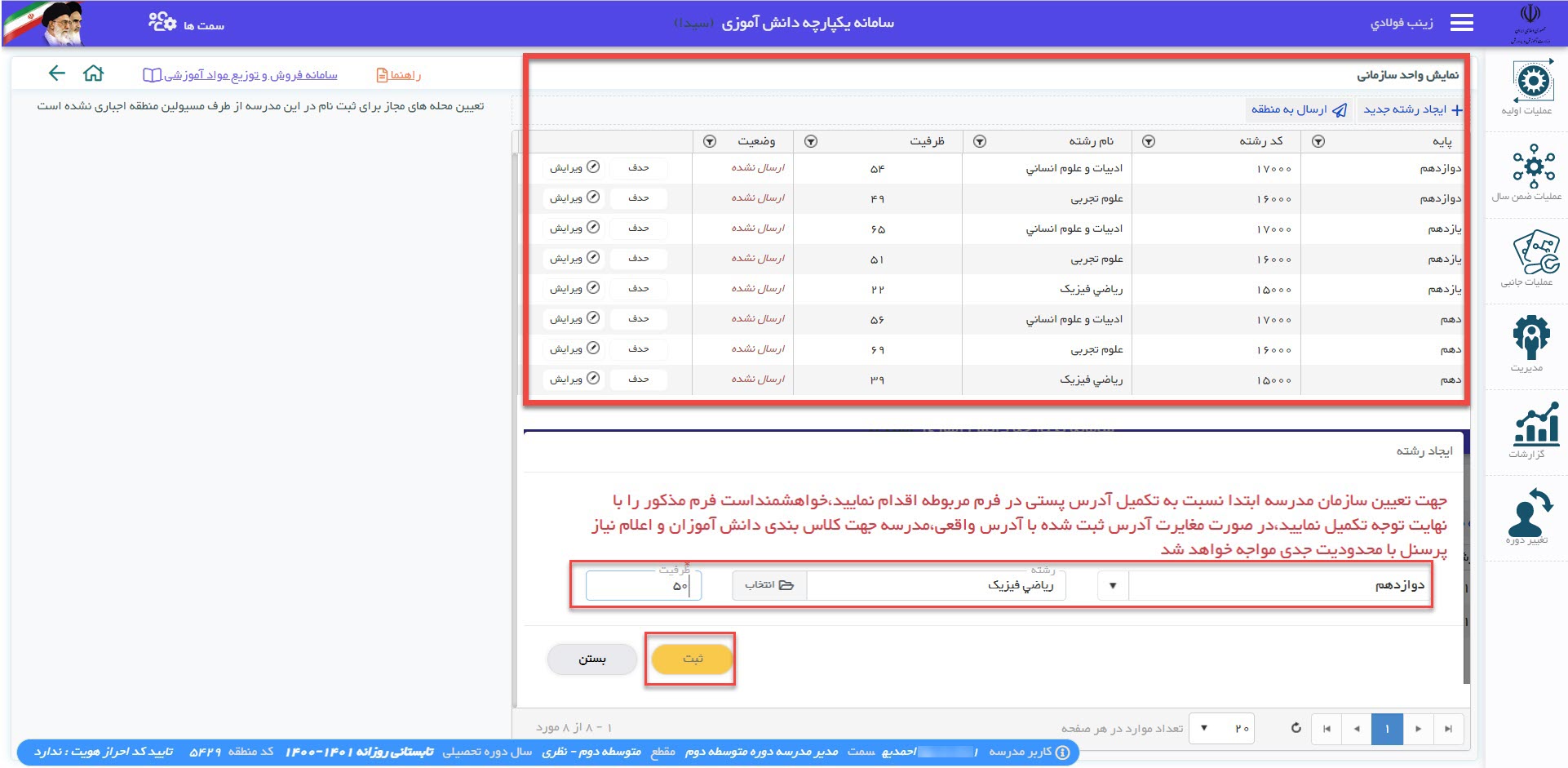 پنج) در این صفحه ابتدا روی عنوان ایجاد رشته جدید، کلیک نموده و در پنجره ای که در اختیار شما قرار می گیرد پایه و رشته را انتخاب نمایید.