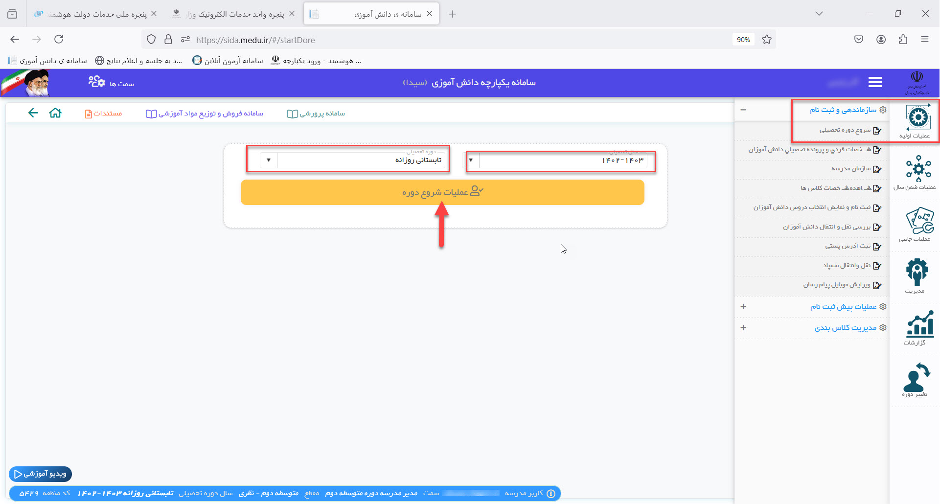یک) ابتدا وارد سامانه سیدا شده و از بخش سازماندهی و ثبت نام عنوان شروع دوره تحصیلی را کلیک نمایید.