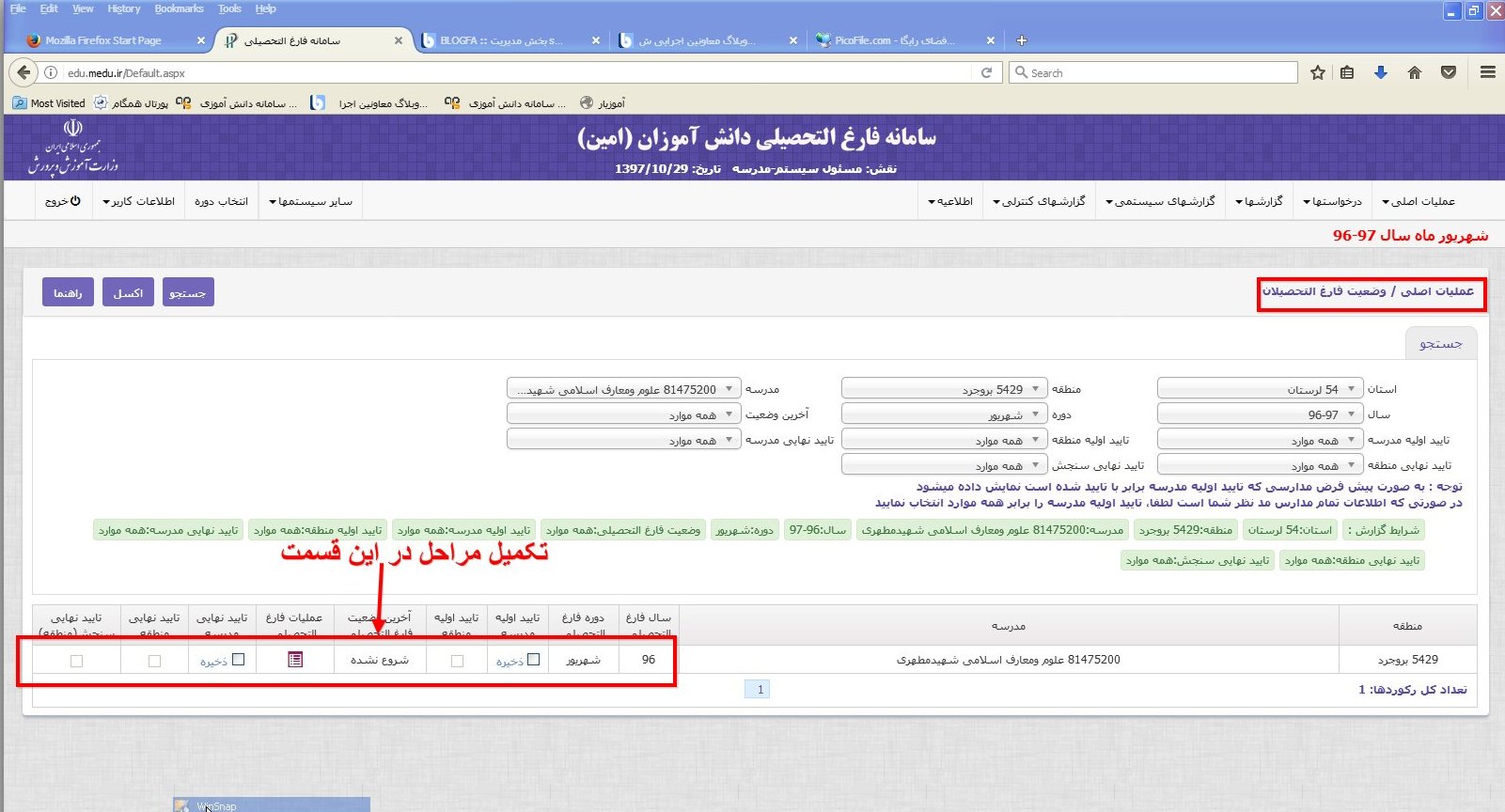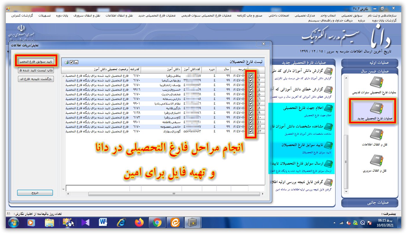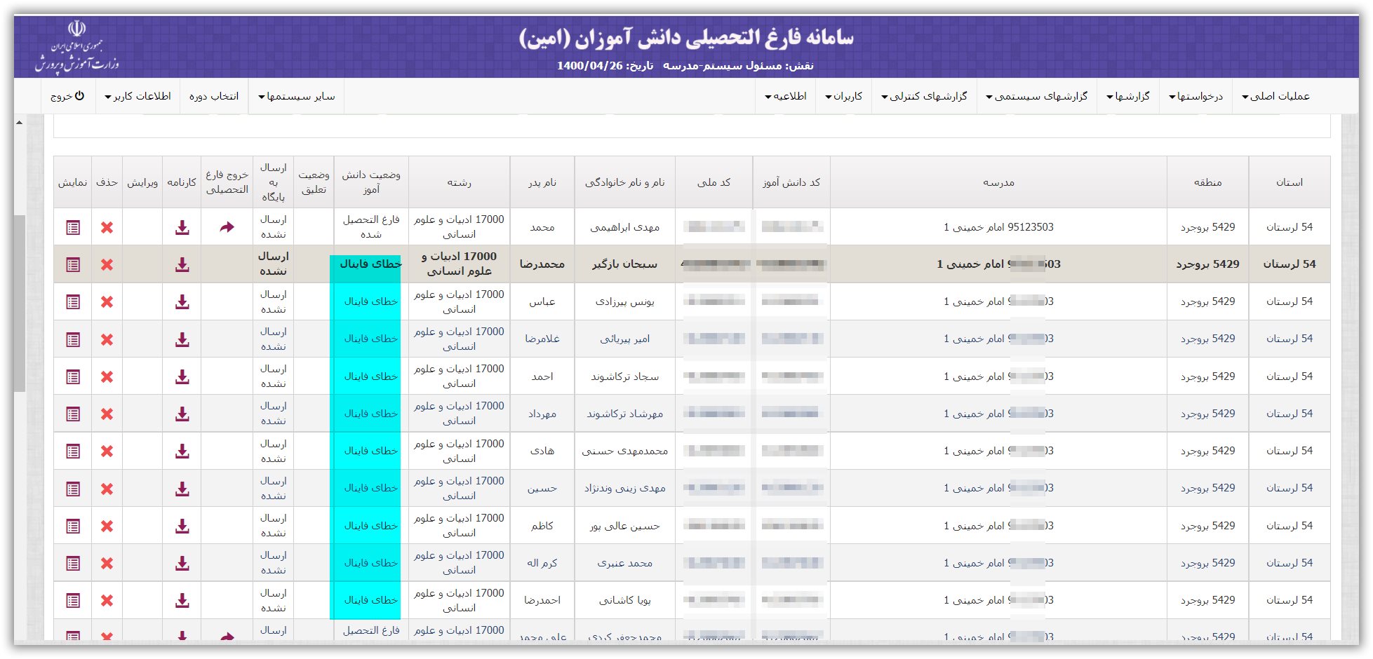 ۱۷. پس از تکمیل کلیه مراحل فوق و با مشخص شدن دانش آموزان فارغ التحصیل، نوبت به ارسال اطلاعات فارغ التحصیلان به پایگاه عملیاتی امین میرسد. اما قبل از این کار باید اطلاعات دانش آموزان، با توجه به شناسنامه بررسی گردد تا در صورت هرگونه مغایرت برطرف شوند.