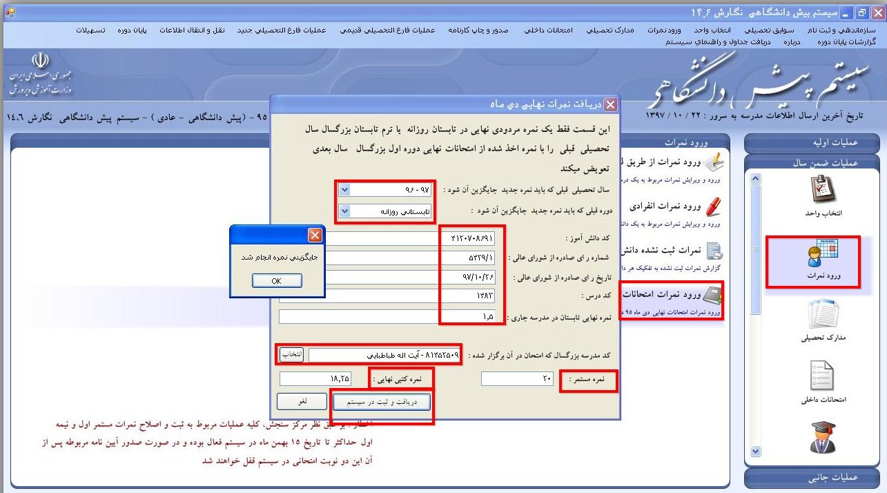 ۱. از ثبت نمرات دانش آموزان چه دروس داخلی و چه دروس نهایی اطمینان کامل حاصل نمایید.