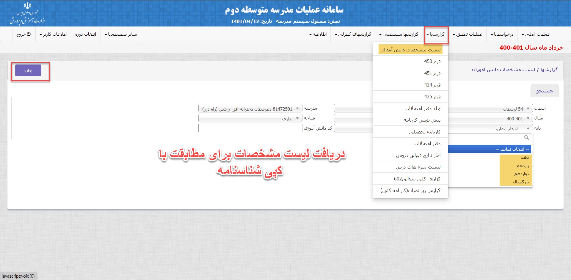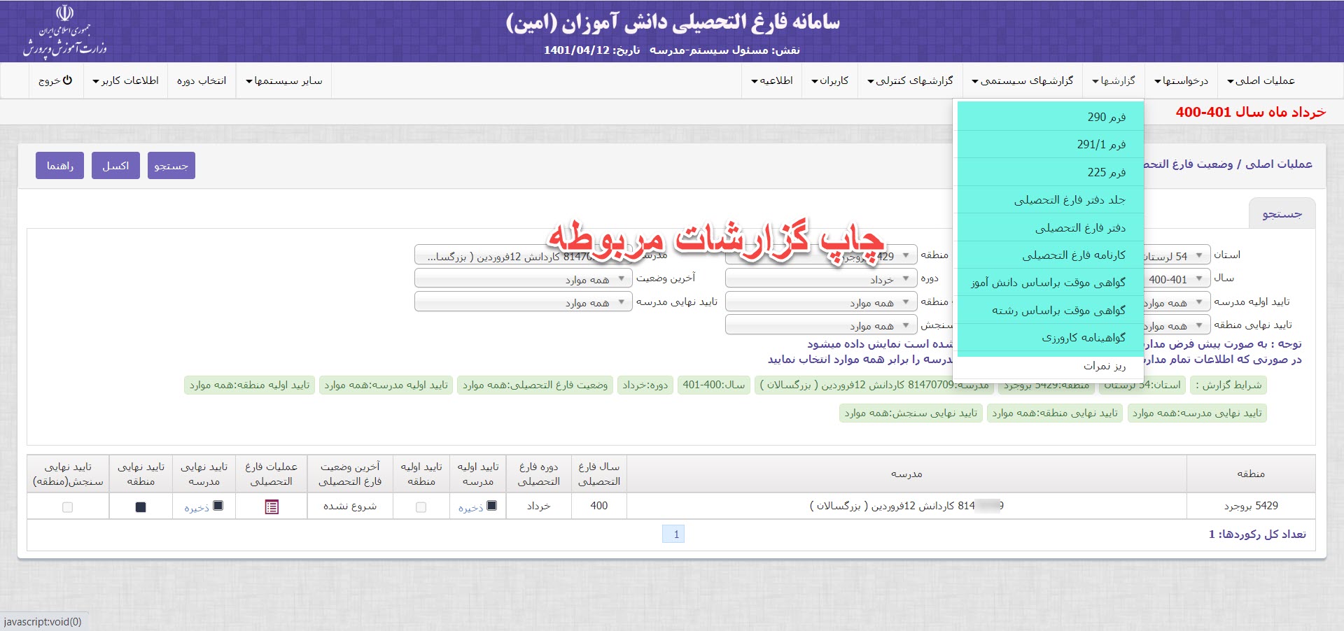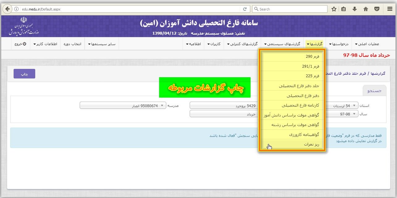 ۲۲. در پایان کار مدارس میتوانند از قسمت گزارشها نسبت به چاپ کارنامه فارغ التحصیلی و همچنین گواهی موقت دانش آموزان اقدام نمایند.