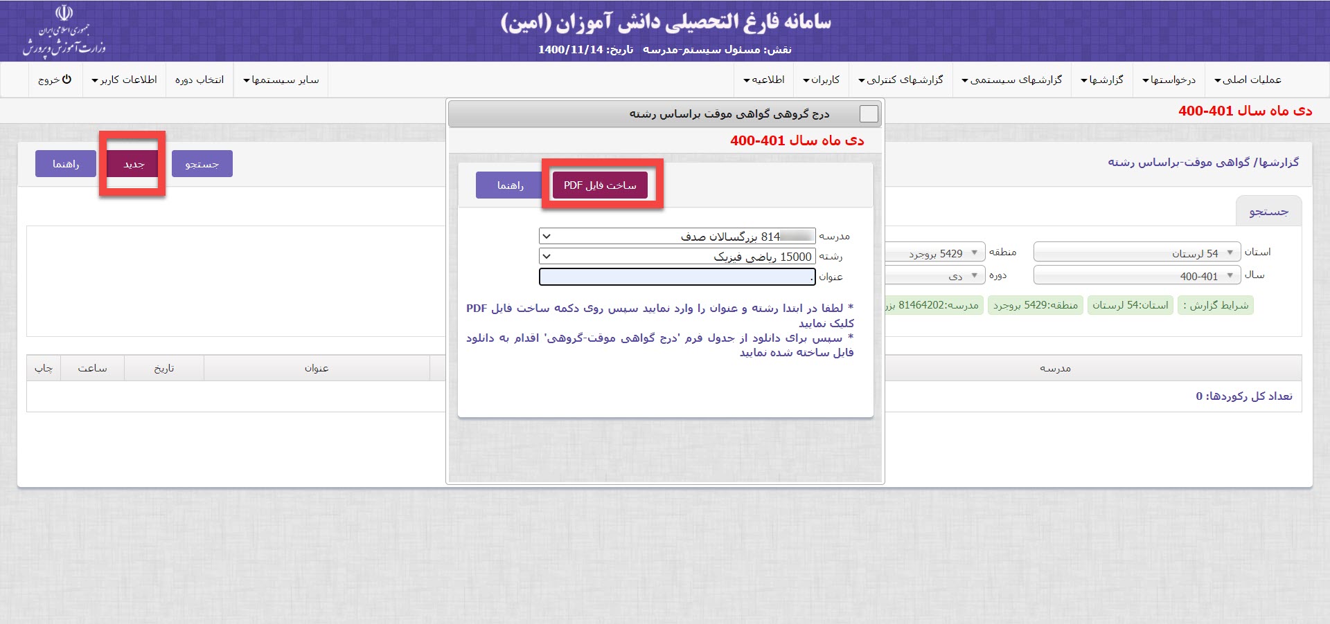 ۲۴. با ورود به این بخش ابتدا بر روی عنوان جدید کلیک کرده و مراحل تکمیلی را انجام میدهیم تا بتوانیم گواهی موقت دانش آموزان را چاپ نماییم.