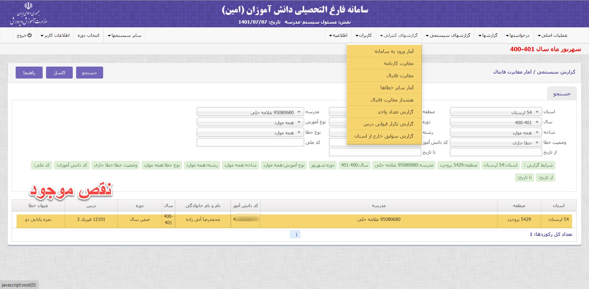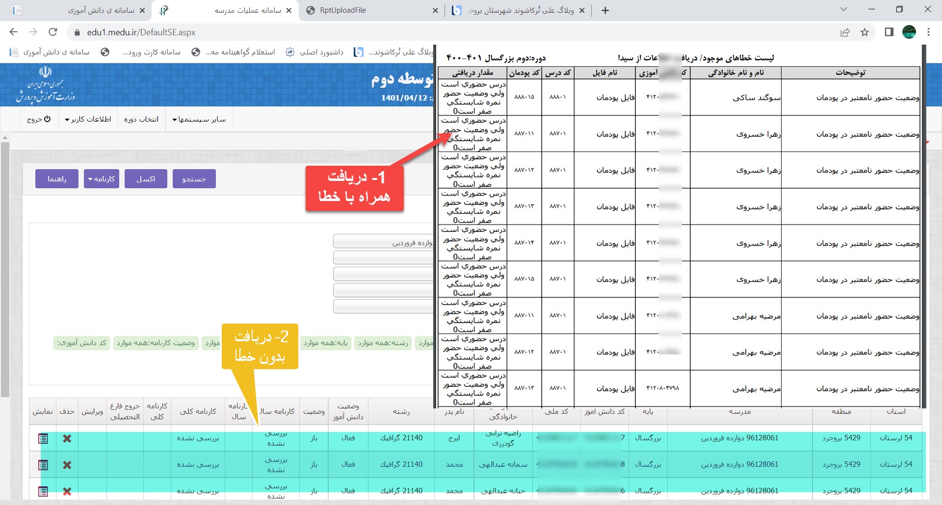 الف- لیست خطا: اگر دانش آموزی دارای نقص باشد در این قسمت قرار میگیرد. این نقص میتواند مربوط به اطلاعات هویتی، انتخاب واحد و یا عدم ثبت نمره باشد.