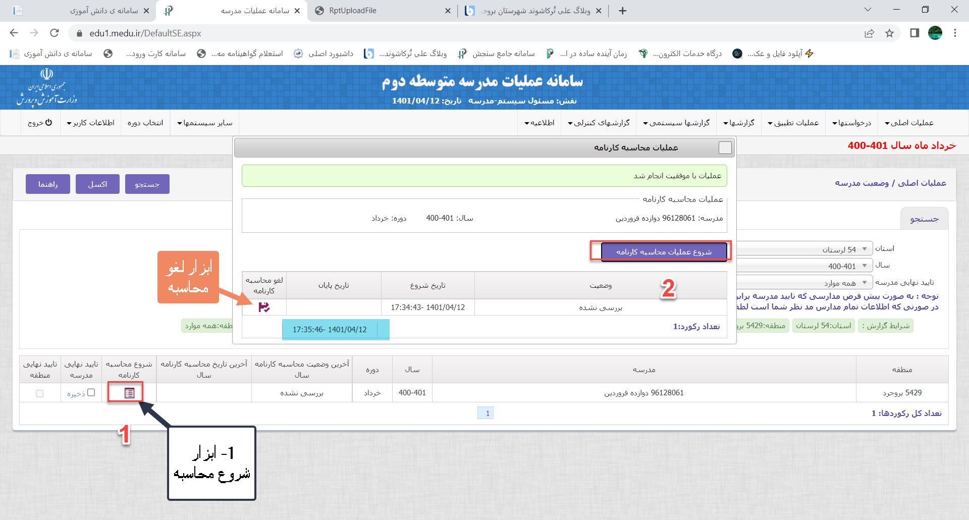 ۱۳. پس از اطمینان از ارسال اطلاعات کلیه دانش آموزان و صحت اطلاعات از قسمت عملیات اصلی، عنوان وضعیت مدرسه را لمس نموده و از قسمت شروع محاسبه کارنامه، روی ابزار موجود کلیک نمایید و در نهایت عنوان شروع عملیات محاسبه کارنامه را لمس کنید. با ثبت تاریخ شروع محاسبه میبایست منتظر بمانید تا تاریخ پایان محاسبه نیز ثبت گردد.