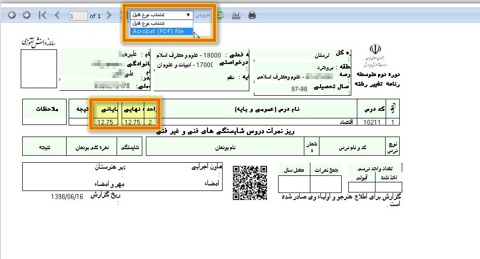 برای این که بتوانید این گزارش را ذخیره نمایید گزینه (Acrobat PDF File) پی دی اف را انتخاب نموده و بر روی ذخیره کلیک نمایید.