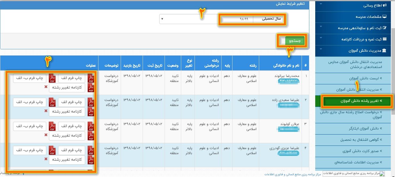 توجه2: از بخش تغییر رشته دانش آموزان با انتخاب سال تحصیلی و کلیک بر روی جستجو می توانید اسامی دانش آموزان متقاضی تغییر رشته را مشاهده نمایید.